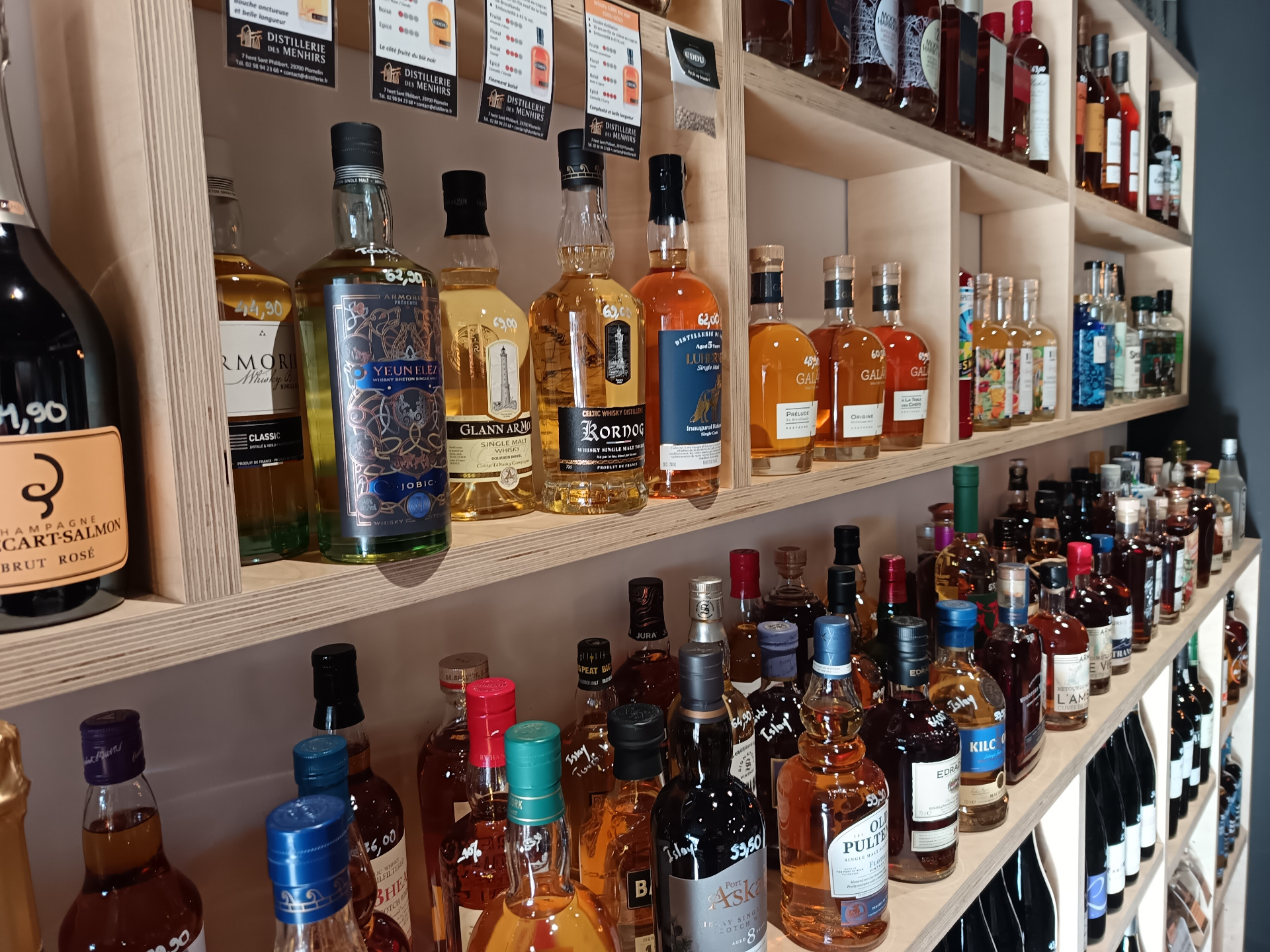 Les amateurs de whisky ne seront pas en reste : des créations locales, raffinées et audacieuses, reflétant le caractère unique de la Bretagne et l'art de ses distillateurs. Mais l'aventure ne s'arrête pas là : rhums, liqueurs et autres trésors liquides vous attendent pour éveiller vos sens et enrichir vos dégustations.