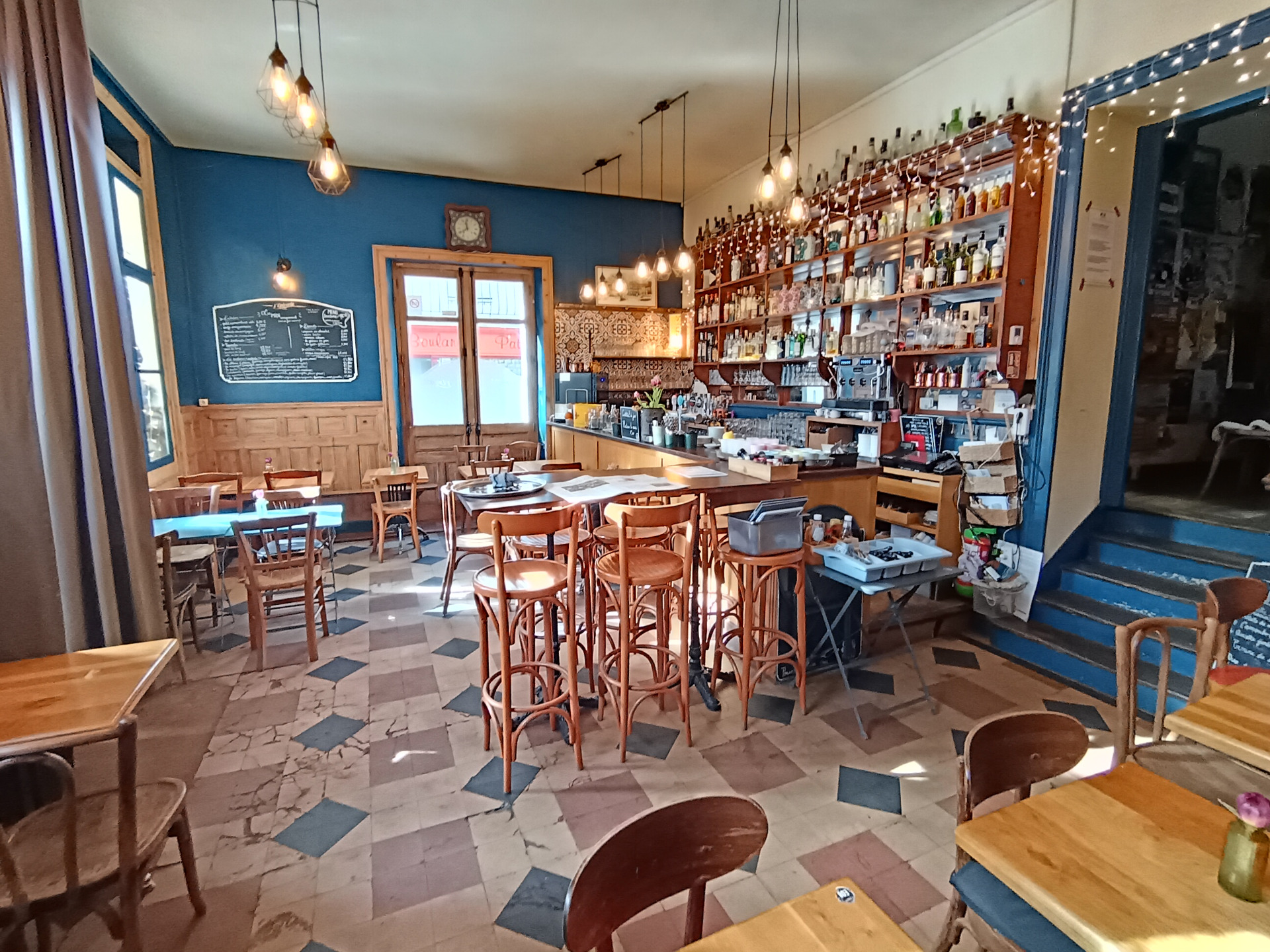 Une devanture douce, bleu tendre, des tables rouges qui s'éveillent au soleil, quelques chaises vertes prêtes à accueillir les conversations du jour. On y vient presque comme on entre dans une maison amie.